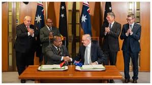 कैनबरा, 6 अक्टूबर । ऑस्ट्रेलिया और पापुआ न्यू गिनी ने सोमवार को एक महत्वपूर्ण रक्षा संधि पर हस्ताक्षर किए। इसका उद्देश्य दक्षिण प्रशांत क्षेत्र में चीन के बढ़ते सैन्य प्रभाव को कम करना और ऑस्ट्रेलिया के उत्तरी क्षेत्र के जरिए चीन द्वारा उसके शक्ति प्रदर्शन काे रोकना माना जा रहा है।