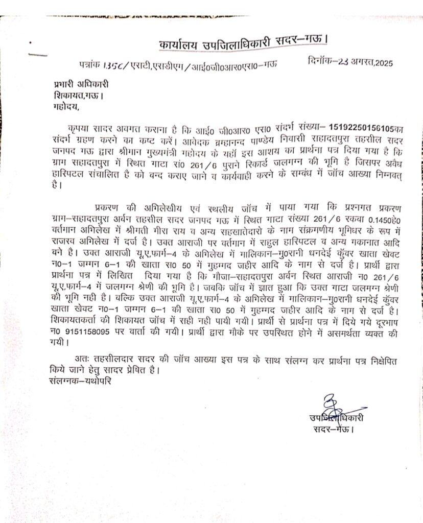 शासन मे पड़ी इस शिकायत की जाँच की जिम्मेदारी शासन ने जिलाधिकारी मऊ को सौपी, फिर डीएम द्वारा उपजिलाधिकारी से मामले मे जाँच आख्या तलब की गईं। एसडीएम ने अपनी जाँच मे एक ही जमीन को नान जेड ए और जेड मे दर्शाते हुए, यह कर रिपोर्ट को आईजी आरएस पर रिपोर्ट अपलोड कर दी कि शिकायत सही नहीं पाई गईं।