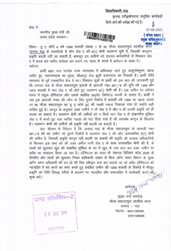 विभागीय सूत्रों के अनुसार उपजिलाधिकारी मऊ के द्वारा नगर के मौजा सहादतपुरा मे स्थित गाटा संख्या 261/6 को 1369 फसली के राजस्व रिकॉर्ड मे नान -जेड- ए मे दर्ज होना बताते हुए यह शिकायत की गईं थी की जमीन के स्वामियों ने राजस्व विभाग से मिलकर अविधिपूर्ण तरीके से आरोपित भूमि को जेड- ए मे अंकित कर उसको अविधिपूर्ण तरीके से विक्रय कर दिया हैं। आरोपित जमीन को जेड ए मे अअंकन को लेकर राजस्व रिकॉर्ड मे किसी आदेश का उल्लेख नहीं हैं।