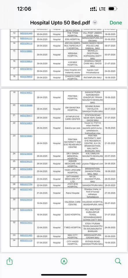 मऊ(एफ आई नेटवर्क)। जिले मे इलाज के दौरान मे हुई चार मौतो के बाद शासन और प्रशासन द्वारा हॉस्पिटलो की कराई गईं जांच पूरी तरह से मनमाने तरीके से पदीय अधिकारों का दुरूपयोग करतें हुए की गईं है। जाँच मे 20 शैय्या वाले हॉस्पिटल और 50 शैय्या वाले हॉस्पिटलस की जो सूची जाँच के बाद जारी की गईं है वह, अस्पताल की भौतिक स्थिति का हॉस्पिटल प्रबंधन द्वारा पंजीकरण के दौरान सरकारी अभिलेखों मे सलग्न साक्ष्यों से बिना मिलान किये, मनमाने तौर पर जारी कि गईं है। मजे की बात तो यह है कि किसी भी सूची पर न तों सीएमओ के हस्ताक्षर है न विभागीय मुहर।