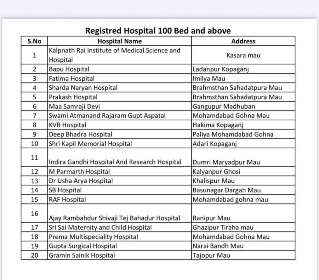 मुख्य चिकित्साधिकारी मऊ के द्वारा जिले बैध 20 शैय्या और 50 शैय्या के हॉस्पिटलो की जो सूची जारी की गईं है उसमे तमाम खामिया है। 20 शैय्या के अस्पतालो मे “सीएमओ” ने उन अस्पतालो के नाम का उल्लेख किया है जो 20 फिट, से भी कम, चौड़े मार्ग पर है, जिनसे अग्नि समन विभाग के वाहन आसानी से प्रवेश नहीं कर सकते है। 50 शैय्या वाले हॉस्पिटलो के मानक मे हॉस्पिटल कों कम से कम 36 फिट चौड़े रास्ते पर मौजूद होना उतना जरुरी है जितना उस हॉस्पिटल का रजिस्ट्रेस्ट्रेशन जरुरी है। यही नहीं कम से कम 1000-1500 बर्ग मीटर एरिया मे बने 50 शैया होसोटल के लिए ओपेरेशन थिएटर, आई सी यूँ, आईसीसीयूँ, लेबर रूम, फार्मेसी लेबोरेटरी, महिलाओ और पुरुष के अलग अलग वार्ड के साथ फायर एग्जिट, इमरजेंसी सीढ़िया की आवश्यकता भी बताई गईं है।