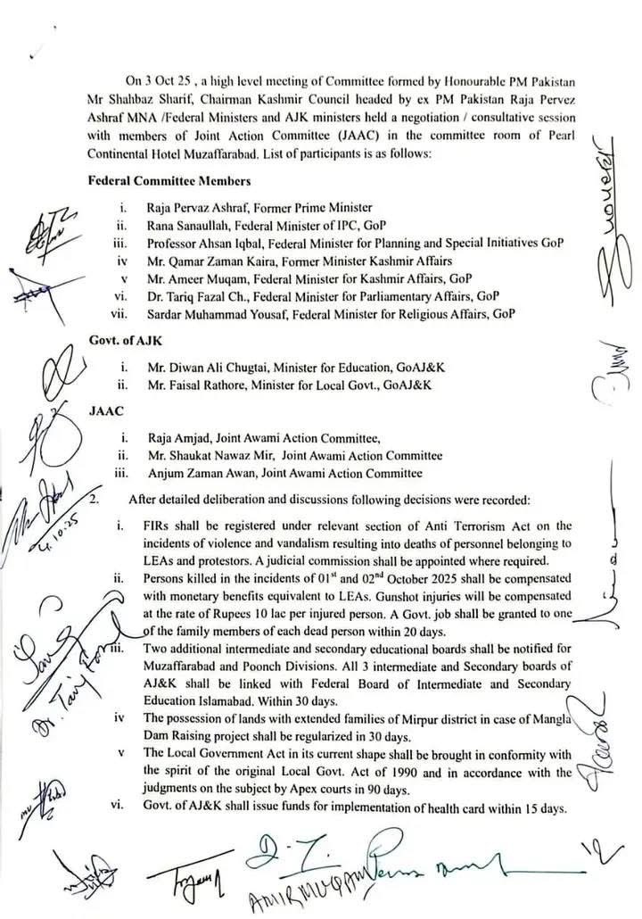 इसके अलावा 01 और 2 अक्टूबर की घटनाओं में मारे गए व्यक्तियों के परिजनों को वही मुआवजा मिलेगा जो सुरक्षा बलों के मामलों में निर्धारित है। गोली लगने से घायल प्रति व्यक्ति को 10 लाख रुपये का मुआवज़ा दिया जाएगा। प्रत्येक मृतक के परिवार के एक सदस्य को 20 दिनों के भीतर सरकारी नौकरी दी जाएगी। इसके अतिरिक्त मुज़फ़्फ़राबाद और पुंछ संभागों में दो नए इंटरमीडिएट और सेकेंडरी शिक्षा बोर्ड स्थापित किए जाएंगे। पीओके के तीनों शिक्षा बोर्डों को 30 दिनों के भीतर संघीय इंटरमीडिएट और सेकेंडरी शिक्षा बोर्ड इस्लामाबाद से जोड़ा जाएगा। सरकार 15 दिनों के भीतर स्वास्थ्य कार्ड लागू करने के लिए धन जारी करेगी।