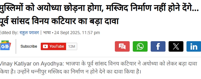 यह भारतीय जनता पार्टी (BJP) के पूर्व सांसद विनय कटियार ने बुधवार को एक प्रेस वार्ता के दौरान कहा है, उन्होंने कहा कि मुसलमानों को जल्द से जल्द अयोध्या जिला छोड़ देना चाहिए। उन्होंने जोर देकर कहा कि इस मंदिर नगरी में किसी भी मस्जिद के निर्माण की अनुमति नहीं दी जाएग